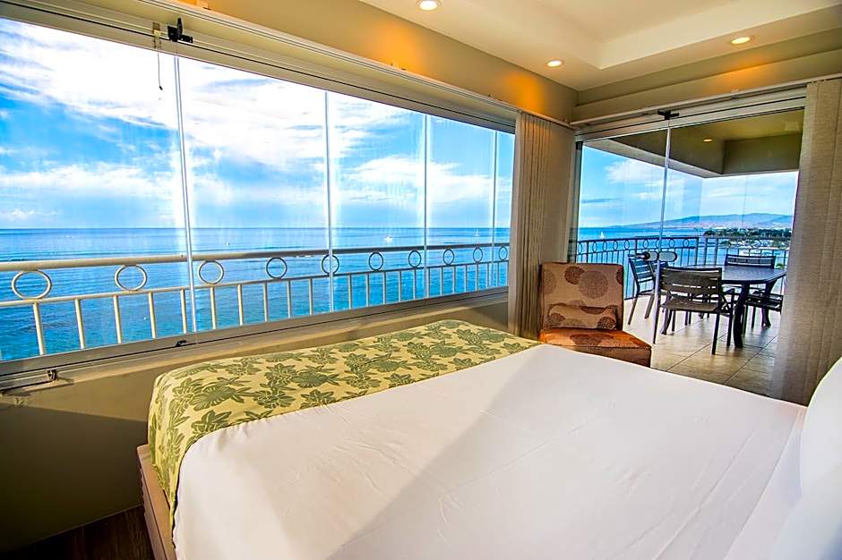 Enjoy stunning ocean views from this studio condo, located in the only condominium building on Waikiki Beach. Perfect for couples or solo travelers, this cozy retreat offers everything you need for a relaxing stay by the beach. • Waikiki Shore address is: 2161 Kalia Road, Honolulu, HI 96815 • Guest must check-in at Regency on Beachwalk, 255 Beachwalk, Honolulu, HI 96815 • Kitchen includes stovetop, oven, microwave, refrigerator, coffeemaker, blender, rice cooker, cookware and tableware • Welcome essentials kit includes coffee, tea, sugar, creamer, dish soap, sponge, paper towels, dishwasher detergent & laundry detergent • 1 queen bed or 2 twin beds • Tub/shower combination • Bath amenities include shampoo/conditioner, soap & hair dryer • Air conditioning and ceiling fan • Drapes • Washer/dryer in unit • TV with standard cable • Wi-Fi • In-room safe • Iron and board • Smoke detectors and fire sprinklers • Balcony with furniture • Children 17 years and under are free when sharing room with parent(s) utilizing existing beds Each unit has its own unique décor and furniture